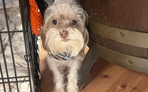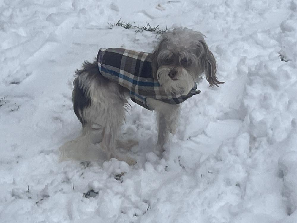 One encouraging sign: GIZMO is eager to go outside to potty — even in the snow — which strongly suggests he was never allowed outside of his crate in his former life. Inside, he will use a pee pad if he must, but he clearly prefers the outdoors when given the chance.