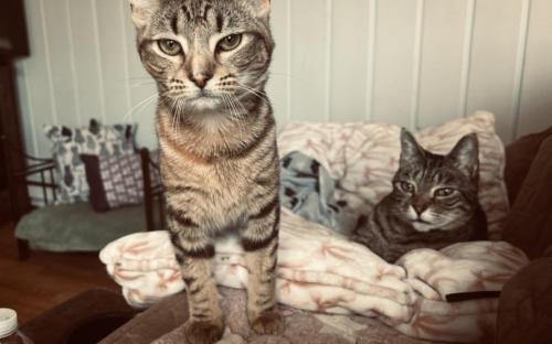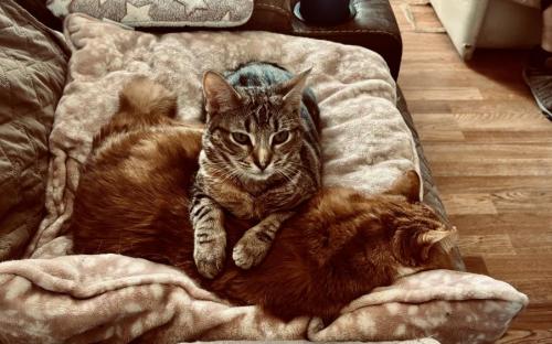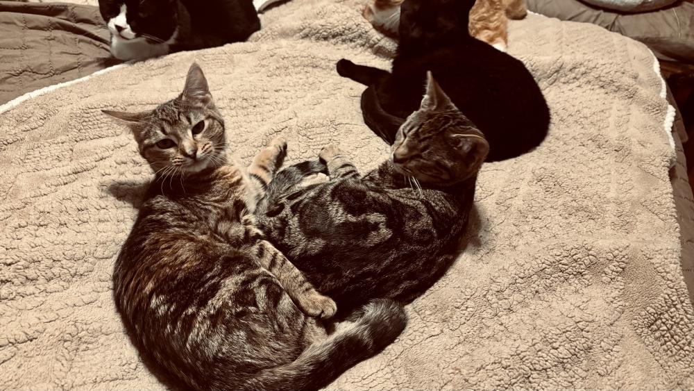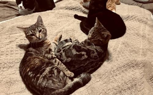 LILY is a mama's girl and loves to sit in her foster mom's lap and just be nearby. She is also very attached to some of the older cats in the foster home. They let her cuddle with them and don't play as hard as her brother RIVER.
