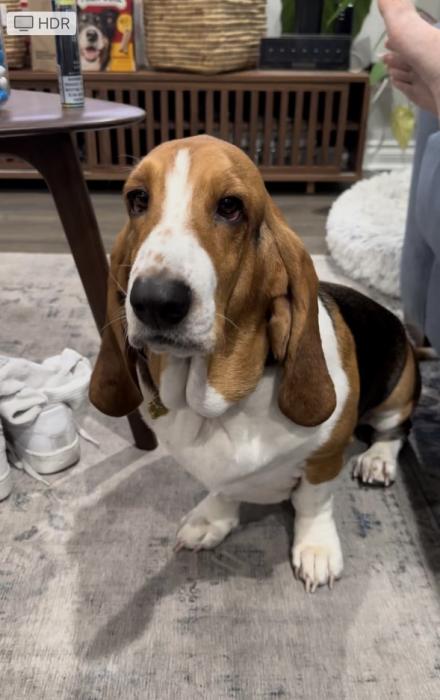Brown, black and white very friendly. He is a Bassett Hound. 2 1/2 years old.