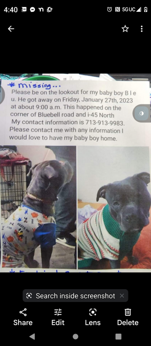 I am 1yr old male XL Pitbull bully. My coat is blue in color with a white chest, floppy ears, and blue eyes. I have been missing since January 27th at about 9:00 a.m. . I was last seen on the corner of Blue Bell road and i-45 North. If you see me please call 713-913-9983 thank you