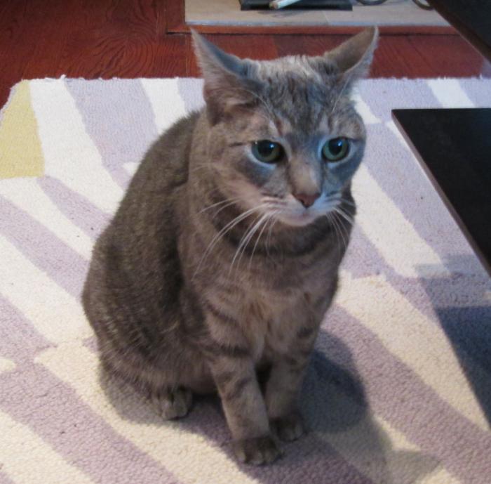 Hana is a senior (14 year old) gray tabby with white and dark grey markings.