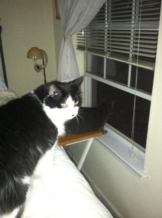 Tuxedo male, medium length fur, fluffy black tail, green eyes, white strip across back of neck, white paws all black back. Missing since 11/16/2014 from Country Rd New Hartford CT. We just moved here, he may be trying to go home to East Granby but has no idea which way to go.