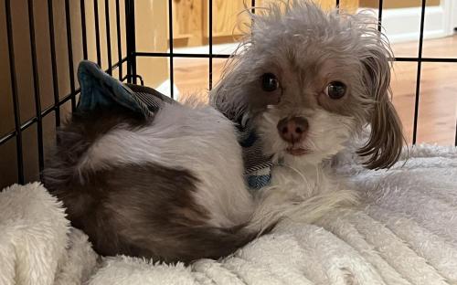 One encouraging sign: GIZMO is eager to go outside to potty — even in the snow — which strongly suggests he was never allowed outside of his crate in his former life. Inside, he will use a pee pad if he must, but he clearly prefers the outdoors when given the chance.